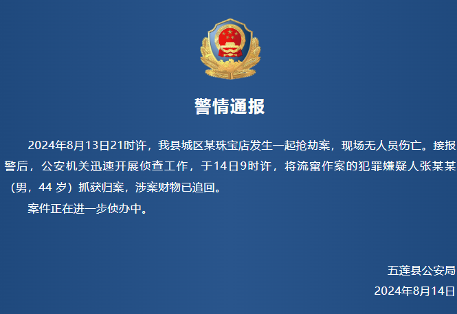 通报中表示,接报警后,公安机关迅速开展侦查工作,于14日9时许,将流窜作案的犯罪嫌疑人张某某(男,44 岁)抓获归案,涉案财物已追回。