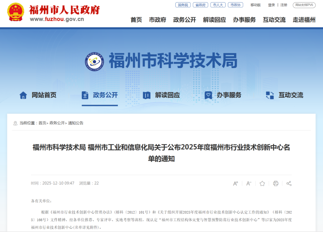 12月9日,福州市科学技术局、福州市工业和信息化局联合公布《2025年度福州市行业技术创新中心认定名单》,四创科技申报的“福州市智慧防灾行业技术创新中心”(以下简称“中心”)成功入选。这是对四创科技长期深耕减灾兴利领域、强化自主创新实力、推动行业协同创新的充分肯定。